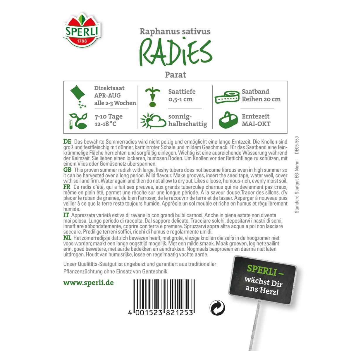 Parat‘ ist ein Radies, das nicht pelzig wird. Die Knollen sind groß, besonders festfleischig, mit dünner, karminroter Schale und mildem Radiesgeschmack. Eine bewährte Sommersorte. Auch geeignet zur Folgeaussaat in den Hochsommermonaten. Der Verwendungszweck ist äußerst vielseitig z. B. zur Garnierung, als Salat, als Rohkost, als Suppe oder Brotbelag. Zur Anzucht im Frühjahr einen sonnigen, im Herbst einen schattigen Standort wählen und lockere, nährstoffreiche Erde verwenden. Mit dem SPERLI-SAATBAND ist das Säen kinderleicht: Auslegen, gießen, wachsen lassen. Das Vereinzeln entfällt.