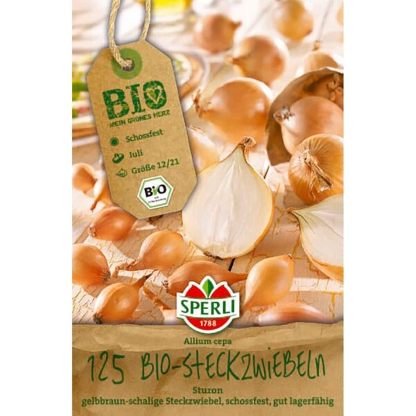 Große, runde, gelbbraune, schossfeste aromatische Zwiebel aus biologischem Anbau. Die Sorte ‚Sturon‘ ist festschalig und sehr gut lagerfähig. Gemüsezwiebeln setzt man als etwa kirschgroße Steckzwiebeln in den Boden. Nach der Ernte werden die Zwiebeln zusammengebunden und an einem luftigen Ort aufgehängt und getrocknet.