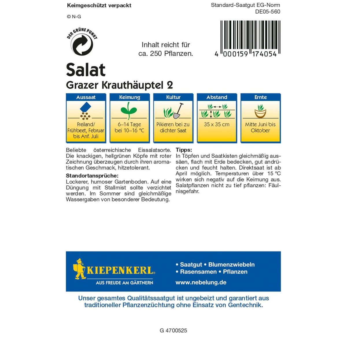 Beliebte österreichische Eissalatsorte. Die knackigen, hellgrünen Köpfe mit roter Zeichnung überzeugen durch ihren aromatischen Geschmack, hitzetolerant.